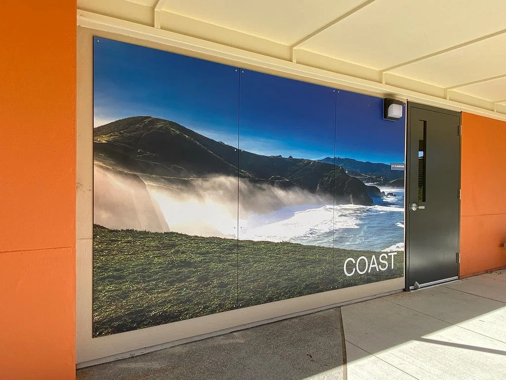 Each building displays an education exhibit with immersive graphics depicting ecozones along a transect from the Pacific Ocean to the San Francisco Bay.